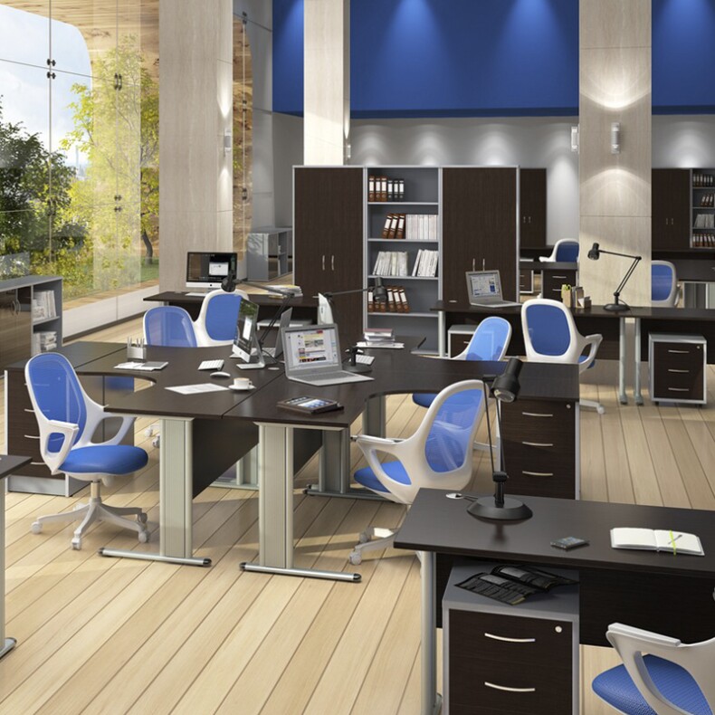 Регулируемые опоры столов и шкафов: металлические с пластиковым основанием, диапазон регулировок – до 15 мм.